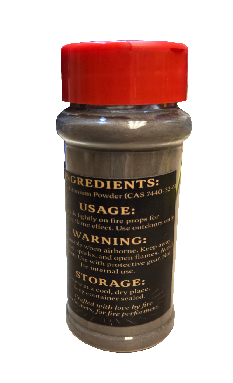 Elevate your fire performance with our Pyro Dust, a 100% titanium powder designed to add a mesmerizing sparkle to your flames. Created by Infrared & Deltablue specifically for fire dancers in the Southwest, this product lets you create stunning effects that captivate your audience. Simply sprinkle it lightly on your fire props for an unforgettable display—perfect for outdoor events!